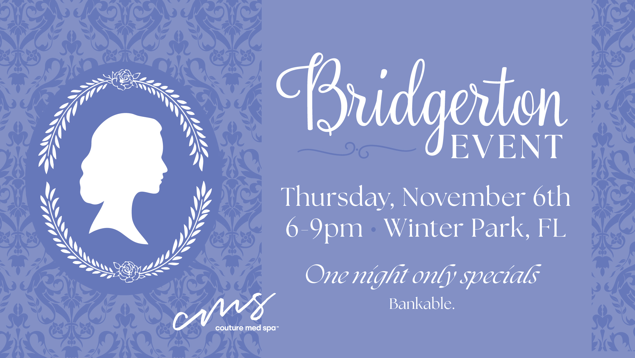 You may have heard the whispers of a most exquisite gathering of the season. Our Bridgerton Themed Soirée promises an evening filled with indulgence, beauty, and sophistication worthy of Lady Whistledown's praise. This is not merely a gathering, it's an opportunity to uncover timeless beauty, indulge in luxurious self-care, and enjoy the most splendid offers of the season. Delight in elegant bites, music, and exclusive specials on treatments and services. But I do regret to inform that spots are limited, so secure yours today. Once the guestlist is full, no amount of persuasion will sway the gatekeepers of your entry.
